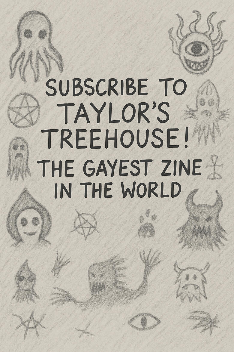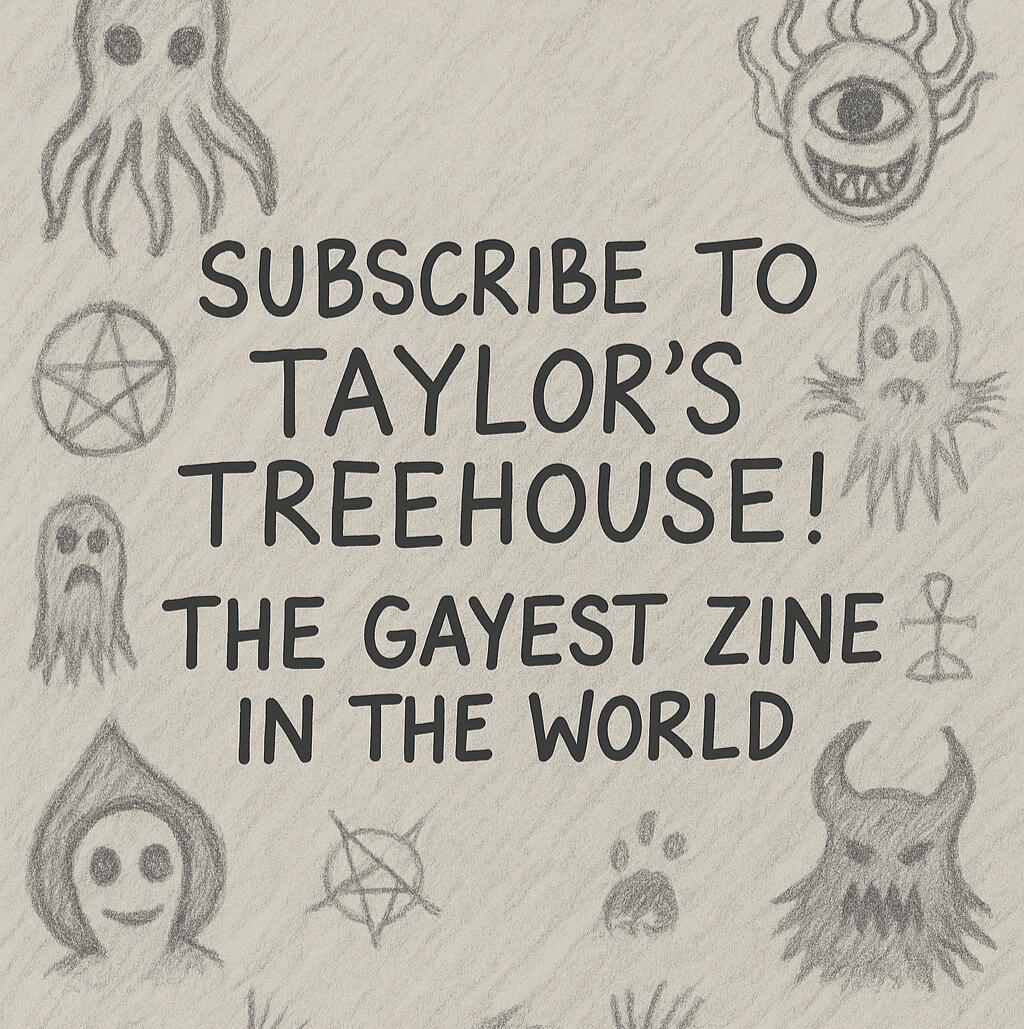 Taylor’s Treehouse is a free zine disguised as a newsletter, or a free newsletter disguised as a zine. I'm really not sure yet, to be honest.It’s where I scream about books, drop exclusive shit, and sometimes beg you to buy and review my work, all more fun and silly than your average author's newsletter!Subscribers get: